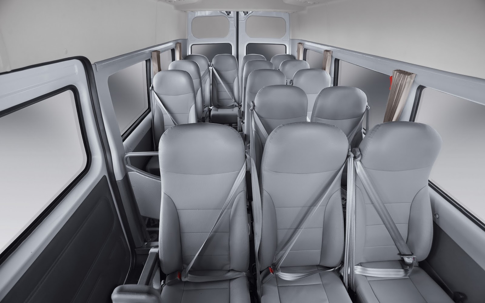El interior del Sunray está diseñado para maximizar el confort de los pasajeros, con asientos cómodos y ergonómicos dispuestos en filas que permiten una distribución eficiente del espacio. Los asientos están tapizados en materiales duraderos y fáciles de limpiar, ideales para uso intensivo. Dependiendo de la versión, el vehículo puede contar con aire acondicionado para todas las filas de asientos, lo que garantiza el confort térmico de los pasajeros en trayectos largos.