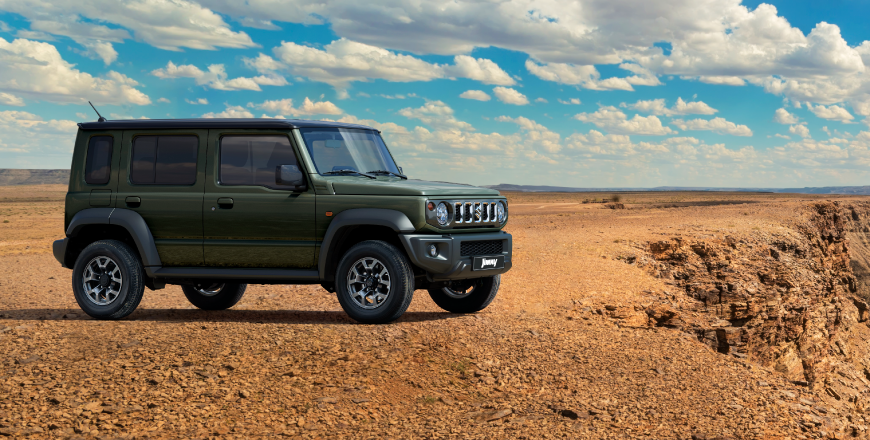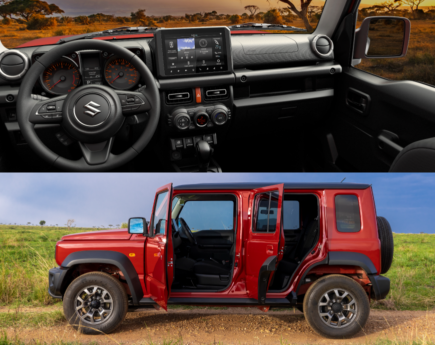 Al igual que la versión de 3 puertas, el Jimny 5 puertas está inspirado en los vehículos todoterreno icónicos de los años 70 y 80. La versión más grande está diseñada para aquellos que necesitan más espacio y practicidad, pero aún buscan un vehículo compacto con verdadera capacidad para aventuras fuera de la carretera. Se basa en el mismo chasis robusto de largueros, pero ahora con una distancia entre ejes mayor, lo que mejora el espacio interior.